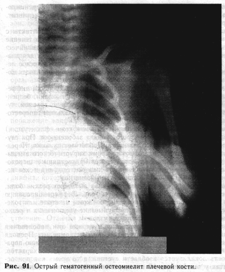 К. С. Терновой и соавт (№9) указывают на недостаточную информативность этого метода и ухудшение состояния никоторых детей после его применения Контрольные рентгенограммы производят на 10-12-й день заболевания. К этому времени появляется первый рентгенологический признак острого остеомиелита длинных трубчатых костей: рядом с тенью коркового слоя диафиза или метафнза появляется периостит в виде тонкой линейной пластинки, идущей вдоль кости (рис. 91). Протяженность периостита зависит от степени отслойки надкостницы экссудатом Рентгенологические изменения в костях появляются приблизительно через 3—4 нед от начала заболевания. В толще коркового сдое или в губчатом веществе метафиза начинают выделяться отдельные светлые очаги разрушения, которые, сливаясь, рентгенологически проявляются остеопорозом. Кость становится прозрачной, трабекулярная сеть широкопетлиста, корковый слой истончается. На фоне остеопороза нередко можно заметить линию патологического перелома кости. Наряду с процессами разрушения появляются и признаки костеобра-зования: утолщение кортикального слоя за счет измененного периоста. Очаги разрежения окружаются склерозированными стенками, кость становится пестрой, грубопятнистой. Следует заметить, что при длительном течении заболевания на рентгенограмме преобладают признаки остеосклероза. При переходе острого остеомиелита в хронический на рентгенограммах через 3—6 мес выявляются полости, заполненные секвестрами, и значительное утолщение костной ткани. Дифференциальная диагностика. Диагностика острого гематогенного остеомиелита метафизов и диафизов длинных трубчатых костей в типичных случаях не трудна.