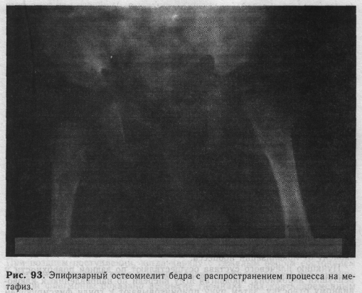 Эпифнэарный остеомиелит возникает преимущественно у детей грудного возраста, обычно являясь одним из проявлений сепсиса. Гнойное воспаление может локализоваться в любом эпифизе (чаще в бедренной и плечевой костях). Иногда встречаются множественные поражения. Прогноз, а также функциональные и анатомические результаты лечения при эпифизарном остеомиелите зависят прежде всего от раннего распознавания заболевания и, следовательно, своевременного начала лечения. Клиническая картина. По течению эпифизарные остеомиелиты можно разделить на токсико-септическую и местноочаговую формы. Токсико-септическая форма эпифизарного остеомиелита характеризуется острым началом с быстрым подъемом температуры тела до 39—40 "С. Общее состояние резко ухудшается, ребенок отказывается от груди, появляется беспокойство, иногда судороги. Черты лица заостряются, кожа принимает серый оттенок. У некоторых детей выражена общая слабость, понижена реакция на окружающее. Часто развиваются диспепсические явления: рвота, жидкий стул. - Местноочаговая форма начинается менее бурно. Вначале появляются недомогание, потеря аппетита, постепенно повышается температура тела (37,5—38 °С). Общее состояние остается сравнительно удовлетворительным или расценивается как среднетяжелое. Интоксикация выражена умеренно. При обеих формах эпифизарного остеомиелита наиболее постоянным признаком является боль в пораженной конечности, вначале без определенной локализации, Грудной ребенок реагирует на болевые ощущения изменением поведения — беспокойством или резким криком, которые усиливаются при всяких попытках движения. Если до болезни ребенок успокаивался после смены пеленок, то при возникновении остеомиелита всякое перекладывание, малейшее изменение положения тела вызывают громкий мучительный крик больного, который долго не может успокоиться. При расспросе матери выясняется, что ребенок в конце 1-х — начале 2-х суток стал особенно беспокоиться при дотрагивании до определенного отдела одной из конечностей. Он избегает всяких активных движений и кричит при попытке пассивного сгибания или разгибания конечности. При осмотре выявляется вынужденное положение пораженной конечности, которое характерно для каждой локализации ос-теомиелитического процесса. Более старшие дети обычно совершенно четко указывают место наибольшей болезненности. При поражении верхнего эпифиза плечевой кости рука ребенка приведена к туловищу, неподвижна во всех суставах. Остеомиелит проксимального эпифиза лучевой или локтевой кости сопровождается сгиба-тельной контрактурой в локтевом суставе. Всякая попытка выпрямления руки или ротации предплечья вызывает плач ребенка. При поражении дистальных эпифизов костей предплечья отмечается свисание кисти, неподвижность пальцев. Верхний эпифиз бедра поражается наиболее часто. При этой локализации процесса нижняя конечность слегка согнута в тазобедренном суставе, ротирована кнаружи и отведена. Активные движения в тазобедренном суставе отсутствуют, пассивные — резко болезненны, особенно ротационные. Поражение эпифизов в области коленного сустава сопровождается сгибательной контрактурой под тупым или даже прямым углом. Для более устойчивого положения конечности и уменьшения боли ребенок отводит ногу и ротирует ее кнаружи. Э
