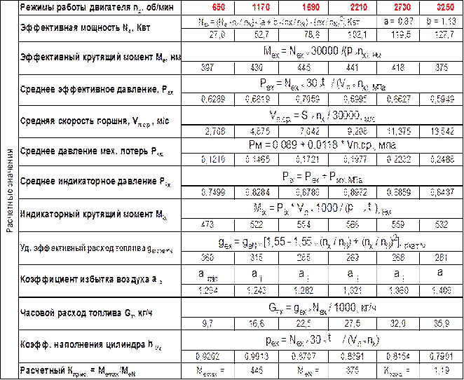 Для сравнения различных методов построения скоростных характеристик и проверки правильности выполнения теплового расчета для нескольких скоростных режимов двигателя дополнительно приведем расчет изменения мощности и удельного расхода топлива на основе процентных соотношений между параметрами относительной скоростной характеристики. Расчетные точки кривой эффективной мощности определяются по следующей эмпирической зависимости через каждые 400 об/мин.