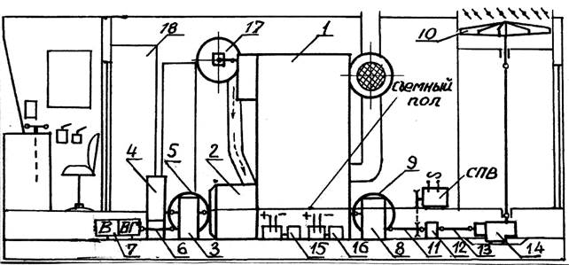 Рис. 1.6. Схема размещения оборудования в кузове тепловоза: 1 – дизель; 2 – генератор; 3 – передний редуктор; 4 – компрессор; 5 – вентилятор воздушного охлаждения ТЭД передней тележки; 6 – вал; 7 – двухмашинный агрегат; 8 – задний редуктор; 9 – вентилятор воздушного охлаждения ТЭД задней тележки; 10 – вентилятор охлаждения воды; 11 – вал; 12 – промежуточная опора; 13 – вал; 14 – гидромуфта привода вентилятора; 15 – топливопрокачивающий насос; 16 – маслопрокачивающий насос; 17 – вентилятор генератора; 18 – высоковольтная камера