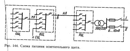 13.1. СХЕМЫ СЕТЕМ На рисунке 144 изображена типичная схема питания осветительной сети. Трансформатор на подстанции (ТП) в целях надежности обеспечивается двойным питанием (1 и II). К объекту от распределительного щита (РЩ) могут подходить одна или две наружные линии (Нл). При одной линии снабже