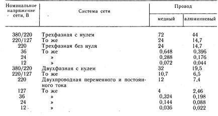 тительных сетей используются провода с алюминиевыми жила- ми — АПВ, АППВ, АППВС, АПР, АПРТО, АПРН, АВТС, АВТ, АРТ и медными жилами — ПВ, ППВ, ППВС, ПР, ПРТО, ПРН, а также кабели — АВРГ, АНРГ, АВП, ВРГ, НРГ (расшифровка проводов: А — алюминиевая жила, П — полихлоридамидная изо ляция, ПВ — поливинилхлоридная изоляция, второе П — плоский провод, Р — резина, Н — найритовая изоляция, С — без разделительного основания, Т—с несущим троссом). В таблице 55 даны рекомендации по применению проводов и кабелей. Сечение проводов выбирается по шкале: 0,5; 0,75; 1,0; 1,5; 2,5; 4; 6; 10; 16; 25; 35; 50; 70; 95; 120 мм2. Медные провода — 0,5...95 мм2, а алюминиевые 0,75.120 мм2. 13.2. ПОТЕРЯ НАПРЯЖЕНИЯ При известных длине двухпроводной линии 1, проводимости проводника ‘I и его сечении З сопротивление линии определяется как