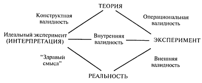 Чем больше влияние на изменение зависимой переменной неконтролируемых исследователем условий, тем ниже внутренняя валидность эксперимента. Следовательно, больше вероятность того, что факты, обнаруженные в эксперименте, являются артефактами. Планирование эксперимента необходимо для повышения влияния независимой переменной на зависимую за счет контроля других переменных. Переменные, являющиеся источником артефактов, либо устраняются, либо их влияние усредняется (за счет смешения и погашения изменчивости условий эксперимента). Высокая внутренняя валидность — главный признак хорошего эксперимента (близко к "безупречному эксперименту"). Не все переменные, влияющие на результат исследования, можно учесть, или исключить (элиминировать). Те из них, которые нарушают внутреннюю валидность, называют "побочными". К числу побочных, полностью неустранимых переменных относят влияние фактора времени, фактор задачи, индивидуального различия. Рассмотрим более подробно центральное понятие "валидность". Обратимся к системе отношений "эксперимент — теория — реальность". На основе теории выдвигается гипотеза, которая в конечном счете и проверяется в эксперименте. Методики и план эксперимента должны соответствовать проверяемой гипотезе — степень этого соответствия и характеризует операциональную валидность. Например, в эксперименте по научению резкий звук зуммера используется как эквивалент "наказания" за ошибку, поэтому возникает сомнение в правильности такой интерпретации. В самом эксперименте мы должны максимально учесть, устранить и т.д. влияние побочных переменных на зависимую переменную. Внутренняя валидность характеризует меру влияния независимой переменной на зависимую по отношению к другим факторам. Иными словами, внутренняя валидность тем выше, чем больше вероятность того, что экспериментальный эффект (изменение зависимой переменной) вызван изменением независимой переменной. Эксперимент должен воспроизводить внешнюю реальность. Эксперимент, который полностью воспроизводит внешнюю реальность, называется экспериментом полного соответствия. Разумеется, в реальности полное соответствие недостижимо. Мера соответствия экспериментальной процедуры реальности характеризует внешнюю валидность эксперимента. Дополнительные переменные, которые требуют учета в эксперименте, влияют на внешнюю валидность. Если от внутренней валид-ности зависит достоверность экспериментальных результатов, то от внешней — переносимость результатов из лабораторных условий на реальные процессы и обобщение их на другие сферы реальности. Наконец, связь теории и реальности отражается в адекватности теории реальности и прогностичности ее предсказаний. Кэмпбелл ввел еще одно важное понятие, характеризующее валидность эксперимента, а именно — конструктную валидность. Конструктная валидность выражает адекватность метода интерпретации экспериментальных данных теории, т.е. в структуру следует ввести четвертую составляющую — интерпретацию: теория — эксперимент — интерпретация — реальность. Конструктная валидность, по мнению Кэмпбелла, характеризует правильность обозначения (интерпретации) причины и экспериментального эффекта с помощью абстрактных терминов из обыденного языка или формальной теории. Таким образом, внутренняя 