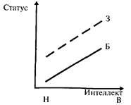 Больные дети имеют более низкий статус, чем здоровые, независимо от уровня интеллекта. Интеллектуалы имеют всегда более высокий статус (независимо от здоровья). Второй вариант: физическое здоровье при наличии высокого уровня интеллекта увеличивает шанс получить более высокий статус в группе.