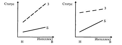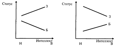 У больных детей, обладающих высоким уровнем интеллекта, меньше шанс получить высокий статус, чем у больных детей с низким интеллектом, а у здоровых — связь интеллекта и статуса позитивная. Теоретически возможно представить, что больные дети будут иметь больший шанс получить высокий статус при высоком уровне интеллекта, чем их здоровые низкоинтеллектуальные сверстники. Последний, четвертый, возможный вариант наблюдаемых в исследованиях отношений между независимыми переменными: случай, когда между ними существует пересекающееся взаимодействие, представленное на последнем графике.