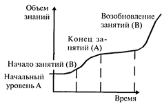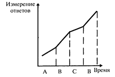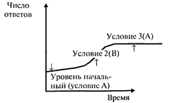 Однако и первый, и второй варианты планирования временных серий не позволяют учесть фактор кумуляции воздействий. Возмож- но, к эффекту приводит сочетание — последовательность условий (А и В). Неочевидно и то, что после возврата к ситуации В кривая примет тот же вид, каким он был при первом предъявлении условий В. Примером плана, который дважды воспроизводит один и тот же экспериментальный эффект, является схема А — В — А — В. Если при втором переходе от условий А к условиям В будет воспроизведено изменение функциональной зависимости ответов испытуемого от времени, то это станет доказательством экспериментальной гипотезы: независимая переменная (А, В) влияет на поведение испытуемого. Рассмотрим простейший случай. В качестве зависимой переменной выберем общий объем знаний студента. В качестве независимой — занятия физкультурой по утрам (например, гимнастикой у-шу). Предположим, что комплекс у-шу благоприятно влияет на общее психическое состояние студента и способствует лучшему запоминанию.