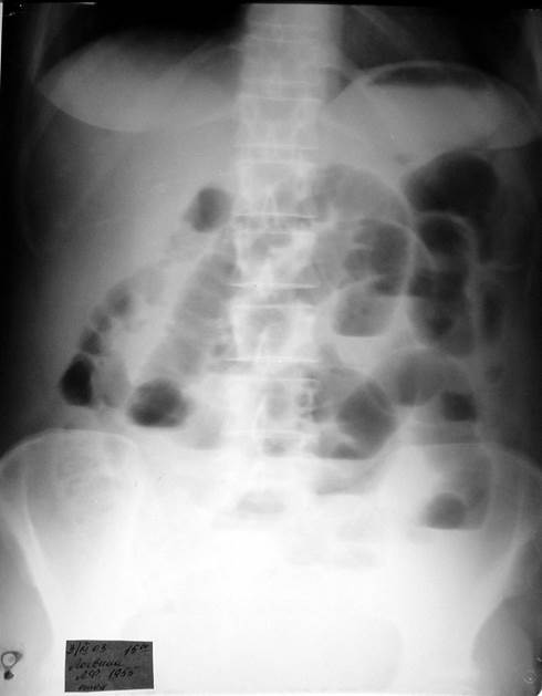 Вопросы к рис. 2: 1) Назовите рентгенологический метод исследования пациента, представленный на иллюстрации. 2) Назовите ведущий рентгенологический признак острой кишечной непроходимости и покажите его на рентгенограмме.