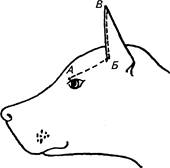 Оперировать щенка желательно в возрасте от 7 до 13 недель. Можно операцию проводить и в более позднем возрасте. Но тогда она сопровождается сильным кровотечением и дает осложнение в виде рубцовых сморщиваний и утолщений краев разреза. В последние годы получает распространение раннее купирование – в 30-35-и дневном возрасте. Техника ранней ампутации не отличается от общепринятой. Основное требование - наличие должного опыта у ветеринарного хирурга, так как пропорции костей черепа и ушных раковин сильно меняются с возрастом. Не допустить диспропорции между размерами ушей и головы взрослеющей собаки – одна из главных задач. За 10-12 часов до операции животное выдерживают на голодной диете. Во время операции необходимо следить, чтобы у животного не было рвоты или асфиксии. После введения нейролептика и местной анестезии, слуховой проход закрывают марлевым или ватным тампоном, чтобы предупредить затекание крови. Ушную раковину купируют на 1/3 ее длины. При этом необходимо учитывать консистенцию ушной раковины, возраст, породу и пол животного. Собакам с длинной головой даже одной и той же породы необходимо оставлять более длинные уши, чем собакам с короткой головой. Голова собаки хорошо смотрится, когда высота купированных ушей, т. е. расстояние от основания переднего края ушной раковины до ее вершины, равна длине линии, проведенной от внутренней глазной щели до переднего края уха (АБ=БВ).