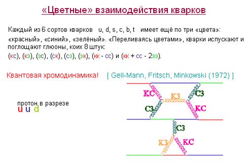Эта наука была создана в 1972 году упомянутым Гелл-Манном, Фритчем и Минковским (Gell-Mann, Fritsch, Minkowski) и названа квантовой хромодинамикой. Она очень похожа на более старую науку квантовую электродинамику, которая диктует, как электроны взаимодействуют с фотонами. Только глюонов не один, как фотон, а восемь, и сами глюоны между собой тоже взаимодействуют. Именно эта, казалось бы, не очень существенная разница приводит к поражающим воображение последствиям, о которых я расскажу дальше. Вернёмся к связанным состояниям. Я начал с того, что всё в мире суть связанные состояния, а теперь взглянем на них ещё раз. Ещё раз перечислим их, начиная с молекул, и тут мне потребуется понятие энергии связи, она же дефект массы. Допустим, вам принесли кирпич и вы молодецким ударом ребром ладони разрубаете его пополам, но перед тем, как ударить по кирпичу, вы на очень точных весах взвешиваете его массу. Потом вы его разбили пополам, взяли два куска, аккуратно собрали все осколки до последней молекулы и опять взвесили. Спрашивается, масса одинаковая или нет, а если нет, то в какую сторону они отличаются? Реплика из зала: Целый кирпич легче. Дмитрий Дьяконов: Правильно, целый легче. Целый кирпич весит меньше, но я прикинул, насколько он будет меньше весить, — всего на 10-12, на одну триллионную часть. Одна триллионная часть и есть энергия связи кирпича. Когда вы что-то составляете, то сумма масс составляющих всегда больше, чем то целое, которое образовалось, если это целое, действительно, держится, а не разлетается тут же само собой. Если там есть дефект масс, и оно держится — это называется связанным состоянием. Всё в мире, что мы наблюдаем и не наблюдаем, суть связанные состояния, начиная от каждого из нас — человек, клетка, молекула, атом — это связанные состояния, которые характеризуются энергией связи или дефектом масс. См. слайд 8. Date: 2015-07-01; view: 336; Нарушение авторских прав |