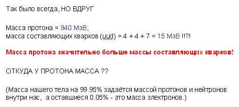 Слайд 9. Спрашивается тогда, откуда же эта масса взялась 940 МэВ, если я беру, составляю протон из кварков и получаю только 1/60 от того