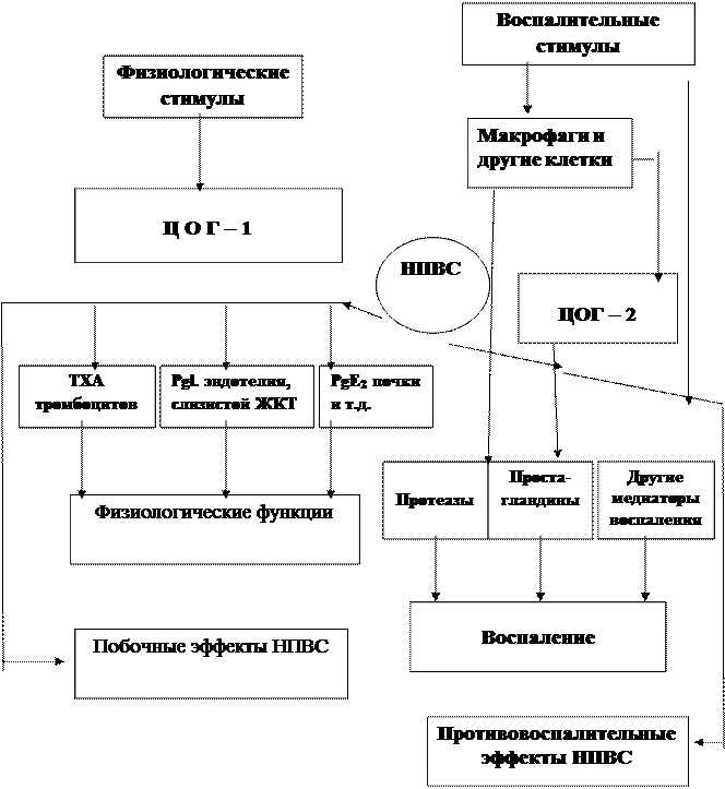 а) являются медиаторами воспалительной реакции: они накапливаются в очаге воспаления и вызывают локальное расширение сосудов, отёк, экссудацию, миграцию лейкоцитов и другие эффекты (в основном ПГ-Е2 и ПГ-I2); б) сенсибилизируют рецепторы к медиаторам боли (гистамину, брадикинину) и механическим воздействиям, понижая порог чувствительности; в) повышают чувствительность гипоталамических центров терморегуляции к действию эндогенных пирогенов (интерлейкина-1 и др.), образующихся в организме под влиянием микробов, вирусов, токсинов (главным образом ПГ-Е2); г) играют важную физиологическую роль в защите слизистой оболочки желудочно-кишечного тракта (увеличение секреции слизи и щёлочи; сохранение целостности эндотелиальных клеток внутри микрососудов слизистой оболочки, способствующее поддержанию кровотока в слизистой; сохранение целостности гранулоцитов и, таким образом, сохранение структурной целостности слизистой оболочки); д) влияют на функцию почек: вызывают вазодилатацию, поддерживают почечный кровоток и скорость клубочковой фильтрации, повышают высвобождение ренина, выделение натрия и воды, участвуют в гомеостазе калия. Существует, как минимум, два изофермента циклооксигеназы, которые ингибируются НПВС (рис. 2). Первый изофермент - ЦОГ-1 - контролирует выработку ПГ, регулирующих целостность слизистой оболочки желудочно-кишечного тракта, функцию тромбоцитов и почечный кровоток, а второй изофермент - ЦОГ-2 - участвует в синтезе ПГ при воспалении. Причём ЦОГ-2 в нормальных условиях отсутствует, а образуется под действием некоторых тканевых факторов, инициирующих воспалительную реакцию (цитокины и другие). В связи с этим предполагается, что противовоспалительное действие НПВС обусловлено ингибированием ЦОГ-2, а их нежелательные реакции - ингибированием ЦОГ-1. В последнее время проведены дополнительные исследования ЦОГ-2 и установлено, что провоспалительная активность может быть присуща ЦОГ-2, а противовоспалительные свойства – третьему изомеру ЦОГ-ЦОГ-3. Подобно другим ферментам ЦОГ, ЦОГ-3 тоже участвует в синтезе простагландинов и играет роль в развитии боли и лихорадки. Однако, в отличие от ЦОГ-1 и ЦОГ-2, ЦОГ-3 не принимает участие в развитии воспаления. Активность ЦОГ-3 ингибируется парацетамолом, который оказывает слабое влияние на ЦОГ-1 и ЦОГ-2. Однако следует заметить, что ЦОГ-3 обнаружен в тканях экспериментальных животных и существование данной изоформы ЦОГ в организме человека требует доказательства, как и требует дальнейшего изучения и доказательства, связанной с ингибированием ЦОГ-3 механизм действия парацетамола.