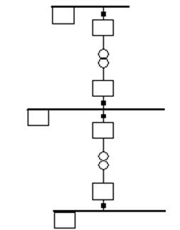 Гілки приєднуються до вузлів за допомогою комірок. з'єднання між двома вузлами здійснюється елементами з двома приєднаннями, такими як трансформатори, вимикачі або лінії. Для елементів з трьома приєднаннями необхідне приєднання до трьох різних вузлів. У загальному випадку, гілки є однокомпонентними елементами, приєднання яких до мережі виконується автоматично при підключенні до терміналів. З точки зору моделі даних, представляє інтерес з'єднання ліній електропередачі (і кабельних ліній), так як вони можуть бути визначені або як сполучний елемент між двома вузлами, або як папки, що містять ділянки ліній, з'єднує два вузли. Розділення лінії на ділянки виконується в тому випадку, коли використовуються різні типи ліній для різних секцій (наприклад, в наступних випадках: в різних секціях кабельної лінії, що з'єднує два вузли, використовуються різні типи кабельної лінії; для різних типів опор ЛЕП; при моделюванні транспонування проводів). Приклад 2.1.2. Створити підстанцію з відгалуженнями. Рішення. Використовуючи результати прикладу 2.1.1 шини підстанцій повинні бути з'єднані з трансформаторами: · Клацніть ЛК миші піктограму · Щоб створити перший трансформатор, клацніть ЛК миші по верхній шині. Тепер трансформатор там графічно з’єзданий з шиною. · Клацніть ЛК миші середню шину, щоб зробити друге з'єднання. · Докладна графічна схема другої підстанції відкриється самостійно. Підключіть трансформатор до однієї комірки, натиснувши на одну із зазначених клем вимикача, як показано на рис. 2.1.4. Результат повинен виглядати як на рисунку 2.1.5. · Повинна відкритись детальна схема першої підстанції. Знову підключіть трансформатор до однієї комірки, натиснувши на одну із відмічених клем вимикача. · Використовуйте той же метод для підключення другого трансформатора між середнім і нижнім терміналами. Однолінійна схема має виглядати як на рис. 2.1.6. Примітка. Існує різниця між простою клемою (без підстанцій) і встановленими більш складними системами шин з підстанціями, які деталізовано представляють підстанції: Якщо ви помістите елемент в систему збірних шин, відкриється детальна схема підстанції (система шин). Ви повинні підключити елемент (в даному випадку трансформатор) до однієї із зазначених клем (великі квадрати, розташовані в кінці встановлених панелей вимикачів).