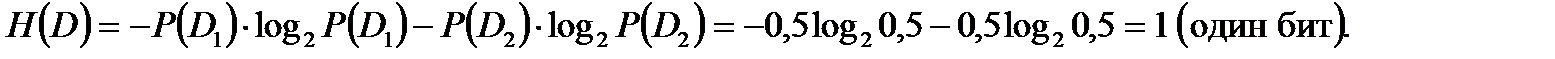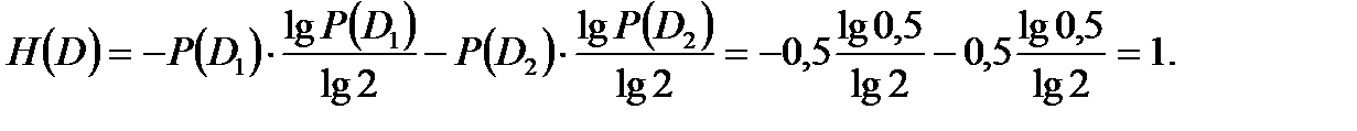 и количество информации, которое несет этот параметр, будет равно нулю. Чем меньше Hх(D), тем больше информации несет измеряемый параметр. При расчетах рекомендуется использовать вместо десятичных логарифмов (9.1) двоичные логарифмы. Целесообразность такого подхода может быть показана на примере, когда имеет место равенство состояний P(D1) = P(D2) =0,5. Тогда согласно (9.1) можно записать [10]: