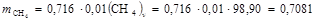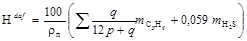 де C daf – масовий вміст вуглецю в паливі на горючу масу, %; H daf – масовий вміст водню в паливі на горючу масу, %; N daf – масовий вміст азоту в паливі на горючу масу, %; O daf – масовий вміст кисню в паливі на горючу масу, %; r н – густина сухого газоподібного палива, кг/нм3. Таким чином, отримано значення, % масового елементного складу природного газу: вуглець – C r = C daf = 73,67; водень – H r = H daf = 24,65; кисень – O r = O daf = 0,12; азот – N r = N daf = 1,56. Масова нижча теплота згоряння Qir