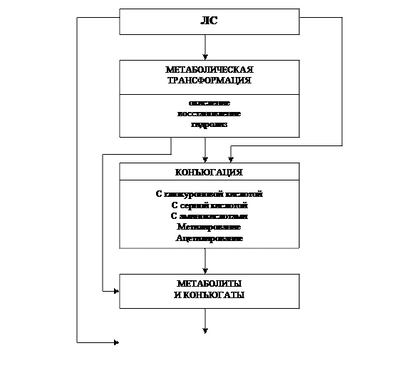 Органические вещества подвергаются в организме различным химическим превращениям (биотрансформации). Выделяют два вида превращений лекарственных веществ: метаболическую трансформацию и конъюгацию. Метаболическая трансформация – превращение веществ за счет окисления, восстановления и гидролиза. Конъюгация – биосинтетический процесс, сопровождающийся присоединением к лекарственному веществу или его метаболитам ряда химических группировок. (Рис.2)