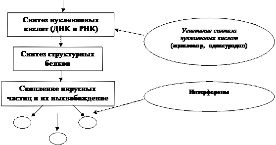 Рис. 34 Схема репликации вирусов и механизм действия противовирусных средств