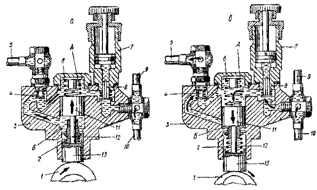 Рис. 3. Загальна будова й робота паливопідкачувального насоса: 1–ексцентрик кулачкового вала паливного насоса високого тиску; 2–пружина штовхача; 3–корпус; 4–нагнітальний клапан; 5–трубка відведення палива до фільтра тонкого очищення; 6–пружина поршня; 7–насос ручного підкачування; 8–впускний клапан; 9–трубка відведення надлишку палива від паливного насоса високого тиску; 10–трубка підведення палива; 11–поршень; 12–шток; 13–штовхач; А –надпоршнева порожнина; Б –підпоршнева порожнина; а –підготовчий хід; б –робочий хід