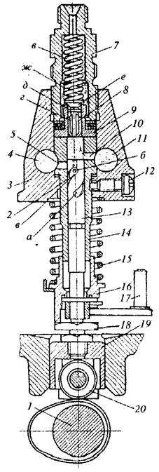 Рис. 5. Насосна секція (насосний елемент) паливного насоса типу УТН-5: 1 – кулачковий вал; 2 – відсічна кромка; 3 – головка паливного насоса; 4, 11 – повздовжні канали; 5 – відсічний отвір; 6, 15 – пружини; 7 – штуцер; 8–нагнітальний клапан; 9 – сідло; 10 – впускний отвір; 12 – установлювальний гвинт; 13 – плунжер; 14 – втулка (гільза); 16 – тарілка пружини; 17 – повідець плунжера; 18 – регулювальний болт; 19 – штовхач плунжера; 20 – ролик штовхача; а, в – гвинтові канали; б – радіальний канал; г – канавка; д – поясок; е – запірний конус; ж – простір над нагнітальним клапаном