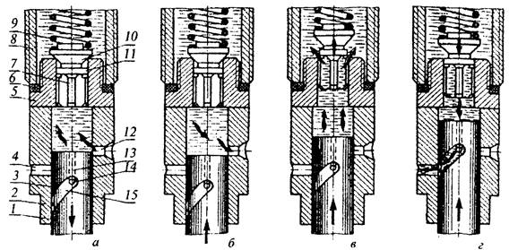Рис. 6. Принцип дії насосної секції (насосного елемента) секційного паливного насоса: а – наповнення надплунжерного простору паливом; б – витіснення палива з надплунжерного простору; в – подача палива; г – відсікання і перепуск палива; 1 – плунжер; 2 – втулка плунжера (гільза); 3 – відсічна кромка; 4 – відсічний отвір; 5 – сідло нагнітального клапана; 6 – прокладка; 7 – нагнітальний клапан; 8 – натискний штуцер; 9 – пружина клапана; 10 – запірний конус; 11– розвантажувальний поясок; 12 – впускний отвір; 13 – осьовий канал; 14 – радіальний канал; 15 – гвинтовий паз