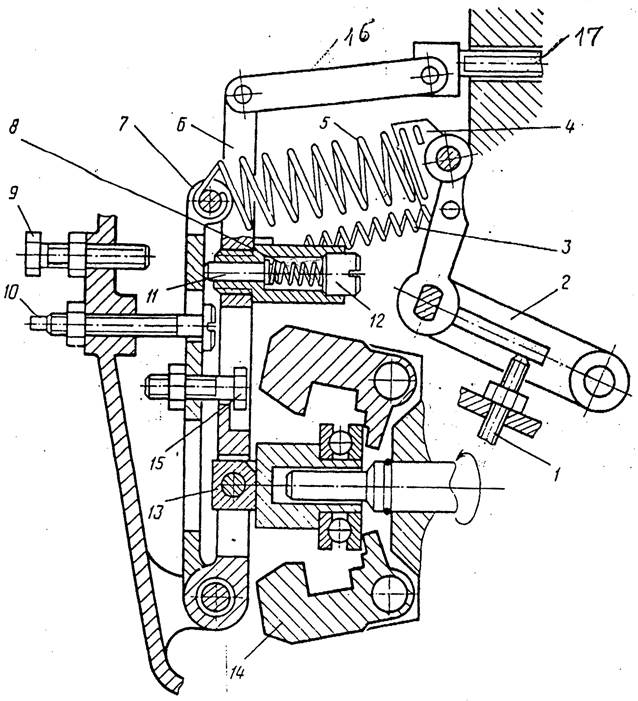 Рис. 8. Схема регулятора паливного насоса УТН–5: 1–болт обмеження максимальної частоти колінчастого вала; 2– важіль управління регулятором; 3 – пружина пускового збагачувача; 4 – серга основної пружини; 5 – основна пружина регулятора; 6 – проміжний важіль; 7 – основний важіль; 8 – пружина коректора; 9 – гвинт жорсткого упору; 10 – гвинт номінальної подачі палива; 11 – шток коректора; 12 – регулювальний гвинт коректора; 13 – п’ята муфти регулятора; 14 – тягарець; 15– болт обмеження розкривання важелів; 16 – тяга рейки; 17 – рейка паливного насоса