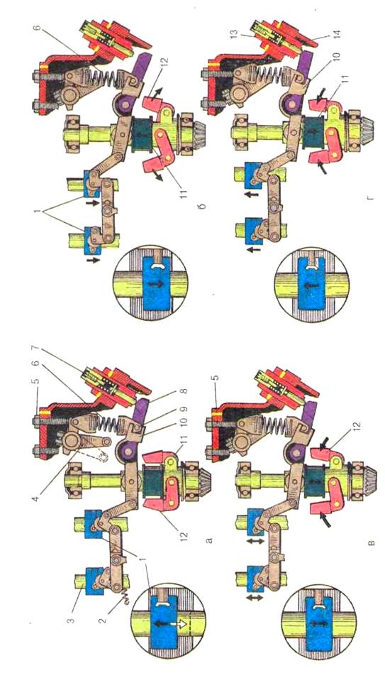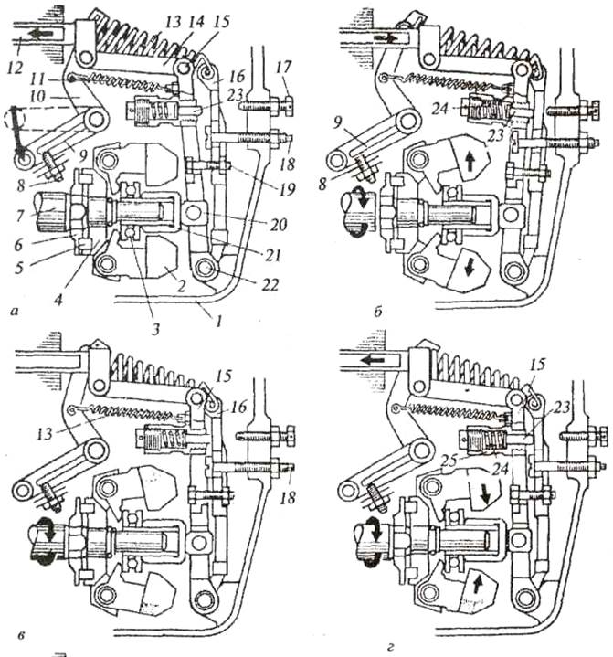 Рис. 9. Схема роботи регулятора паливного насоса УТН-5 на різних режимах роботи дизеля: а - в режимі пуску; 6 - на максимальній частоті холостого ходу; в - в номінальному режимі; г - в режимі короткочасного перевантаження; д - під час зупинки двигуна; 1 - корпус регулятора; 2 - тягарці регулятора; 3 - упорний підшипник; 4 - маточина; 5 - гумовий сухар; 6 - упорна шайба; 7 - кулачковий вал насоса; 8 - регулювальний упорний гвинт; 9 - зовнішній важіль; 10 - внутрішній важіль; 11 - пружина пускового збагачувача; 12 - рейка насоса; 13 - пружина регулятора; 14 - тяга рейки; 15 - проміжний важіль; 16 - основний важіль; 17 - жорсткий упор; 18 - болт номінальної подачі; 19 - з'єднувальний болт; 20 - п'ята; 21 - муфта регулятора; 22 - вісь; 23 - шток коректора; 24 - пружина коректора; 25 - корпус коректора.