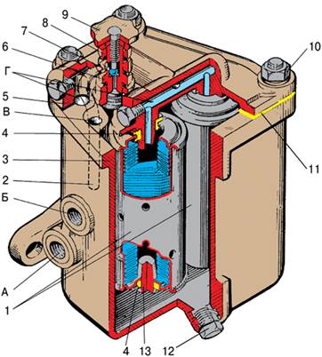 Рис. 11. Фільтр тонкої очистки палива двигуна Д-240: 1 — фільтруючі елементи; 2 — трубка для відведення повітря; 3 — корпус; 4 — кільце ущільнювальне; 5 — кришка; 6 — штуцер вентиля; 7 — кульковий клапан; 8, 10 — гайка; 9 — вентиль; 11 — прокладка; 12 — пробка зливного отвору; 13 — ущільнювач; А — отвір для відведення очищеного палива; Б — отвір для підведення неочищеного палива; В — канал для підведення неочищеного палива; Г – канал для відведення очищеного палива. Роботу регулятора насоса типу НД на різних режимах наведено на рис.12. Для пуску дизеля (рис.12,а) важіль керування регулятором 4 встановлюється у положення максимальної подачі палива до упору в гвинт 5. Основний важіль 10 під дією пружини пуску 2 вибирає зазор у з'єднанні з віссю 9 важеля коректора 8, займає крайнє нижнє положення і через систему важелів установлює дозатори 1 у крайнє верхнє положення, забезпечуючи необхідне для пуску дизеля збільшення циклової подачі палива. Після пуску дизеля, зізбільшенням частоти обертання кулачкового вала насоса, відцентрова сила тягарців 12, долаючи зусилля пружини пуску 2 і пружини регулятора 6, переміщує муфту регулятора 11, основний важіль 10 і дозатори у бік зменшення подачі палива. При роботі дизеля на максимальній частоті обертання холостого ходу (рис. 12,б) основний важіль 10 перебуває у такому положенні, коли відцентрова сила тягарців, прикладена до нього через муфту регулятора 11, врівноважується зусиллям пружини регулятора 6 і через систему важелів установлює дозатори у