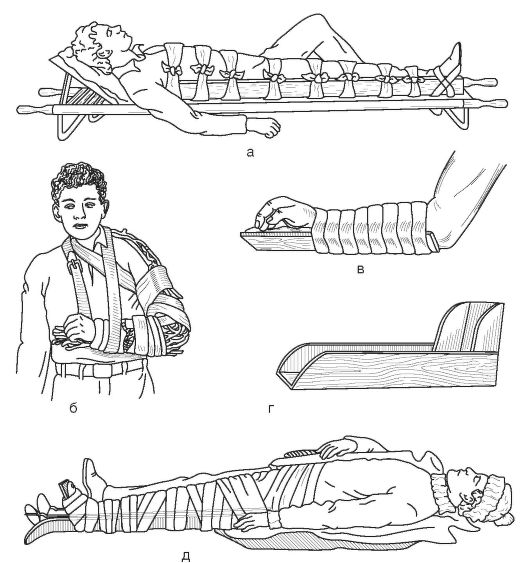 Рис. 30. Иммобилизация импровизированными шинами: а - из досок; б - из хвороста; в - из фанеры; г - из картона; д - из лыж и лыжных палок