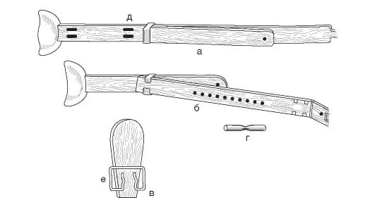 Рис. 33. Шина транспортная для нижней конечности (Дитерихса): а - наружная боковая раздвижная бранша; б - внутренняя боковая раздвижная бранша; в - фанерная подошва с проволочной рамкой; г - палочказакрутка с выточкой; д - парные прорези в верхних деревянных планках боковых бранш; е - прямоугольные ушки проволочной рамки подошвы