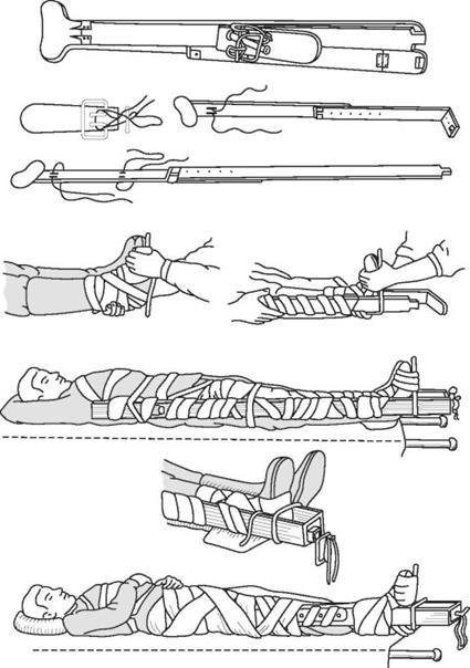 На верхней планке каждой бранши имеются: поперечная перекладина - накостыльник для упора в подмышечную область и промежность; парные прорези для проведения фиксирующих ремней или косынок, с помощью которых шина прикрепляется к туловищу и бедру; гвоздь-шпенек, который расположен у нижнего конца верхней планки. На нижней планке в середине имеется ряд отверстий. Шпенек и отверстия предназначены для удлинения или укорочения шины в зависимости от роста пострадавшего. К нижней планке внутренней бранши прикреплена шарнирами поперечная дощечка с отверстием диаметром 2,5 см в центре. Фанерная подошва шины на нижней поверхности имеет проволочную рамку, которая выступает по обе стороны подошвы в виде прямоугольных ушек. Деревянная палочка- закрутка длиной 15 см имеет посередине выточку. Техника применения 1. Подготавливают боковые деревянные бранши: • планки каждой бранши раздвигают на такую длину, чтобы наружная бранша упиралась накостыльником в подмышечную область, внутренняя - в промежность, а их нижние концы выступали ниже стопы на 15-20 см; • верхнюю и нижнюю планки каждой бранши соединяют с помощью гвоздя-шпенька, место соединения обматывают куском бинта (если этого не сделать, то во время транспортировки шпенек может выскочить из отверстия в нижней планке, и тогда обе планки бранши сместятся по длине); • накостыльники и внутреннюю поверхность обеих бранш обкладывают толстым слоем серой ваты, которую прибинтовывают к шине (возможно применение заранее приготовленных ватномарлевых полос с пришитыми к ним завязками), особенно важно, чтобы ваты было достаточно в местах соприкосновения с костными выступами таза, тазобедренного и коленного суставов, лодыжек. 2. Фанерную подошву плотно прибинтовывают к обуви на стопе восьмиобразными турами бинта вокруг голеностопного сустава. Если обувь на стопе отсутствует, голеностопный сустав и стопу покрывают толстым слоем ваты, фиксируют ее марлевым бинтом, и только после этого прибинтовывают фанерную подошву. 3. По задней поверхности ноги укладывают тщательно отмоделированную лестничную шину, чтобы предупредить провисание голени, и укрепляют ее спиральной повязкой. На участке, соответствующем подколенной области, лестничную шину выгибают таким образом, чтобы придать конечности положение незначительного сгибания в коленном суставе. 4. Нижние концы наружной и внутренней бранш проводят через проволочные скобы фанерной подошвы и соединяют их с помощью подвижной поперечной дощечки внутренней бранши. После этого прикладывают бранши к боковым поверхностям нижней конечности и туловищу. Накостыльник внутренней бранши должен упираться в область промежности, а наружной - в подмышечную область. Тщательно уложив обе бранши, шину плотно прикрепляют к туловищу специальными матерчатыми ремнями, брючным ремнем или медицинскими косынками. К самой же ноге шина пока не прибинтовывается. 5. Приступают к вытяжению ноги. Для этого прочный шнур или бечевку, укрепленные за металлическую рамку на фанерной подошве, пропускают через отверстие в подвижной части внутренней бранши. В петлю шнура вставляют палочку-закрутку. Осторожно вытягивают поврежденную конечность руками по длине. Вытяжение осуществляют до тех пор, пока накостыльники плотно не упрутся в подмышечную впадину и промежность, а длина повр