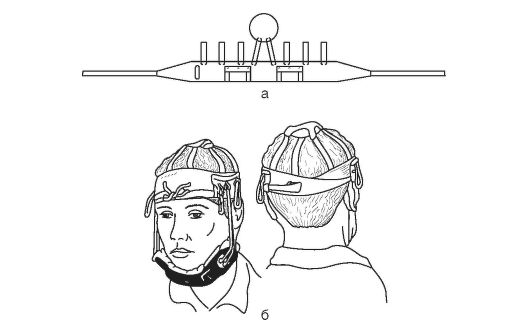 Рис. 35. Шина пластмассовая пращевидная: а - опорная матерчатая шапочка; б - общий вид наложенной шины Техника применения. Опорная матерчатая шапочка надевается на голову и укрепляется с помощью тесемок, концы которых связывают в области лба. Пластмассовую пращу выстилают с внутренней поверхности слоем серой компрессной ваты, завернутым в кусок марли или бинта. Пращу прикладывают к нижней челюсти и соединяют с опорной шапочкой при помощи отходящих от нее резинок. Для удержания пращи обычно достаточно применения по одной средней или задней резиновой петли с каждой стороны. Шины Дитерихса и лестничные шины в настоящее время остаются лучшими средствами транспортной иммобилизации. Некоторые стандартные средства транспортной иммобилизации, например шина транспортная пластмассовая, шина медицинская пневматическая, носилки иммобилизующие вакуумные, выпускаются промышленностью в ограниченном количестве и в повседневной деятельности медицинской службы практического значения не имеют. Date: 2015-07-01; view: 784; Нарушение авторских прав |