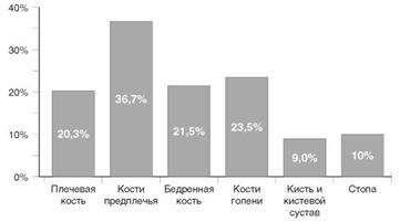Рис. 63. Структура огнестрельных переломов различной локализации