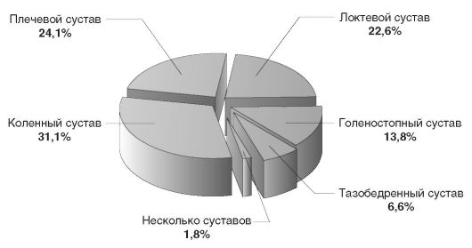 Рис. 64. Структура огнестрельных ранений крупных суставов