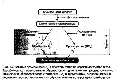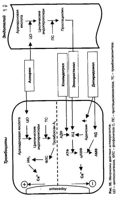 Ацетилсалициловая кислота (аспирин) необратимо ингибирует (ко-валентное ацетилирование) циклооксигеназу в тромбоцитах и эндотелии сосудов и таким образом нарушает образование тромбоксана и простациклина (рис. 55). Преобладает угнетающее влияние ацетилсалициловой кислоты на синтез тромбоксана А2. Во-первых, при приеме внутрь ацетилсалициловая кислота начинает действовать на тромбоциты еще в системе воротной вены, до достижения системного эндотелия. Так как биодоступность ацетилсалициловой кислоты 70%, ее концентрация в крови воротной вены выше, чем в общем кровотоке. Во-вторых, тромбоциты — безъядерные клетки, в них отсутствует система ресинтеза циклооксигеназы. Ацетилсалициловая кислота необратимо ингибирует циклооксигеназу тромбоцитов и синтез тромбоксана А2 в тромбоцитах нарушается на все время их существования — 7—10 дней (можно было предположить, что ацетилсалициловая кислота будет действовать как антиагрегант 7—10 дней, но препарат действует 2 дня, так как через 2 дня образуется полный пул новых тромбоцитов). В то же время в эндотелии сосудов при необратимом ингибировании циклооксигеназы уже через несколько часов происходит синтез нового фермента. Считают, что полное ингибирование циклооксигеназы тромбоцитов ацетилсалициловая кислота вызывает в дозе 160 мг. По данным разных авторов, выраженное снижение агрегации происходит при приеме ацетилсалициловой кислоты в дозах 75—320 мг 1 раз в сутки (чаще назначают 100 мг 1 раз в сутки). При увеличении дозы антиагрегантное действие не повышается и может даже снижаться, так как в этом случае сказывается угнетающее влияние ацетилсалициловой кислоты на синтез простациклина. В качестве антиагреганта ацетилсалициловую кислоту применяют с первых же часов при остром инфаркте миокарда, для профилактики инфаркта миокарда, при нестабильной стенокардии, после коронарной ангиопластики или стентирования, при нарушениях мозгового кровообращения по ишемическому типу, для профилактики тромбообразования при мерцательной аритмии предсердий в случае противопоказаний к назначению антикоагулянтов. Индобуфен - ингибитор циклооксигеназы и тромбоксансинтазы. Назначают внутрь для профилактики тромбоза сосудов сердца и мозга. Клопидогрел и тиклопидин — соединения из группы тиенопири-динов. Ослабляют действие АДФ (блокируют Р2у,-рецепторы АДФ на мембране тромбоцитов). Действие этих соединений необратимо; антиагрегантный эффект развивается в течение 3—10 дней и сохраняется несколько дней после отмены препарата. Назначают клопидогрел или тиклопидин внутрь 1-2 раза в день для профилактики инфаркта миокарда, ишемического инсульта у больных атеросклерозом, после стентирования или баллонной ангиопластики коронарных сосудов. При применении тиклопидина возможно развитие нейтропении (снижается сопротивляемость инфекциям). Дипиридамол (курантил) — антиагрегант и коронарорасширяю-щее средство. Препятствует агрегации тромбоцитов, так как: 1) ингибирует фосфодиэстеразу, инактивирующую цАМФ, и в связи с этим повышает уровень цАМФ (уровень Са2+ в цитоплазме тромбоцитов снижается); 2) повышает уровень аденозина (препятствует захвату аденозина эритроцитами и клетками эндотелия; ингибирует аденозиндезами-назу), который через A2-рецепторы активирует аденилатциклазу и поэтому обладает антиагре