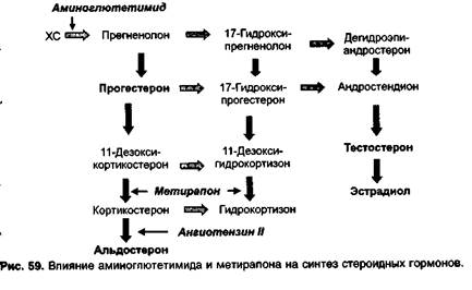 Минералокортикоиды — гормоны коры надпочечников, влияющие на минеральный обмен, главным образом на обмен натрия и калия. Эти гормоны способствуют реабсорбции ионов Na+ и секре- ции ионов К+ в дистальных отделах дистальных почечных канальцев. Таким образом, под влиянием минералокортикоидов в организме задерживается Na+ и увеличивается выведение из организма ионов К+. При избыточной продукции минералокортикоидов возникают: 1) отеки, связанные с увеличением в организме количества натрия и задержкой воды, 2) повышение артериального давления, 3) гипокалиемия, которая обычно сопровождается сердечными аритмиями и слабостью. При недостатке минералокортикоидов (например, при болезни Аддисона) увеличивается выделение натрия и воды почками, что приводит к обезвоживанию организма. Основным минералокортикоидом является альдостерон, его предшественником — дезоксикортикостерон. Лекарственный препарат дезоксикортикостерона дезоксикортон назначают при болезни Аддисона (обычно в сочетании с глюкокортикоидами), а также при миастении. Применяют сублингвально или вводят внутримышечно. В качестве препарата с минералокортикоидной активностью в порядке заместительной терапии внутрь назначают флудрокортизон (кортинефф). Антагонистом минералокортикоидов является спиронолактон (верошпирон), который блокирует рецепторы альдостерона. Применяется при первичном гиперальдостеронизме, в качестве диуретика (с. 214) и гипотензивного средства.