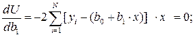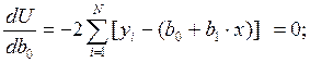 у вигляді вимоги забезпечення мінімуму дисперсії відхилень yi відносно лінійної математичної регресійної моделі y(x). Тому цей метод пошуку оптимального розташування y(x) на регресійному полі має назву "метод мінімізації середнього квадрату" або "метод мінімізації дисперсії відхилень". Щоб забезпечити умову (2), необхідно взяти похідну від U по параметрам a та b, прирівняти її нулю; тоді отримані значення a та b відповідатимуть умові (2) або (3). Отже: U =