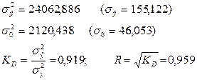 називається коефіцієнтом детермінації (у випадку лінійної множинної регресії) або індексом детермінації (у випадку нелінійної множинної регресії). Фізично він характеризує частку впливу вибраних змінних хj в загальній варіації у.
