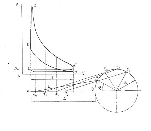 2.Перестраиваем индикаторную диаграмму в развернутую по углу поворота коленчатого вала φ, которая затем используется для нахождения графическим путем суммарных сил, действующих на поршне. Для перестроения под индикаторной строим схему кривошипно-шатунного механизма (рис.7), где прямая АВ соответствует длине шатуна L в мм, прямая ВО- радиусу кривошипа R в мм. Для различных углов поворота φ на прямой АВ графически определяются точки, соответствующие положению поршня при этих углах φ. Из точек на прямой АВ следует провести вертикальные прямые. Пересечение этих прямых с кривыми индикаторной диаграммы дает точки, соответствующие абсолютным значениям