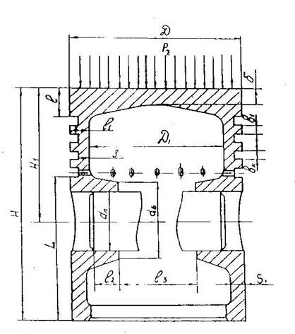Высоту канавок под поршневые кольца (рис) принимают bк= b+Δb; где b – высота кольца, Δb – зазор между кольцом и канавкой по высоте, его принимают 0,02…0,08 мм. Высоту пояска между кольцевыми канавками принимают равной высоте канавки b1=bк. Днище поршня проверяют на статическую прочность как круглую плиту, защемленную по краям и равномерно нагруженную давлением pz. Напряжение изгиба в МПа определяют по формуле: σи=0,17*pz*D12/δ2; где pz – давление газов в конце видимого сгорания, МПа; D1 – внутренний диаметр поршня, м, δ – средняя толщина днища, м. Допустимые значения напряжений [σи], МПа при отсутствии у днища ребер жесткости: для поршней из алюминиевых сплавов________20…25 для чугунных поршней _____________________40…50