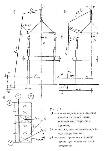 Задача подбора крана решается совместно со справочниками по кранам. Для данного типа крана выбирается длина стрелы и в принятом масштабе отрезок прямой равный ее длине, нанесенный на кальку, располагается между прямыми Р—Р и N—N таким образом, чтобы он касался дуги габарита приближения стрелы к зданию, чтобы вылет стрелы был минимальным, и чтобы верхний конец стрелы был не ниже т. А. От полученной т. М - положения нижнего шарнира стрелы — откладывают отрезок «С», равный расстоянию от нижнего шарнира до оси вращения. При первоначальном выборе крана принимают С = 1,5 м. Расстояние между т. О и линией Р—Р является исходным вылетом LM, по которому определяется (по кривым грузоподъемности) паспортная грузоподъемность крана с выбранной длиной стрелы. Если грузоподъемность крана не соответствует требуемой, выбирается другой кран с такой же или близкой по величине длиной стрелы. При выборе крана, стрела которого оборудована неманевровым гуськом (рис. 3.2а), построения аналогичны описанным (на кальке изображаются оси стрелы и гуська). Следует учитывать, что грузоподъемность вспомогательных кранов на гуське для большинства кранов не превышает 3 и 5 т. При выборе крана в башенно-стреловом исполнении стрелу-башню располагают в минимальном удалении от здания (рис. 3.2 б) и, проведя дугу радиусом, равным длине гуська, до пересечения с прямой Р—Р, находят положение свободного конца гуська. После подбора крана для монтажа плиты, находящейся посредине пролета, проверяется возможность монтажа с этой же стоянки крайних плит на вылете L ‘м (рис. 3.2в). Если монтажная масса плиты превышает грузоподъемность крана на этом вылете, отыскивается точка стоянки крана S’, для которой вылет стрелы LMкр будет соответствовать требуемой грузоподъемности. Следует заметить, что один и тот же кран должен обеспечить монтаж как ферм, так и плит покрытия.