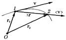Механічний рух буває поступальним, обертальним і коливальним. Поступальним називається рух, при якому всі точки тіла рухаються однаково. При обертальному русі точки тіла роблять поворот навколо вісі обертання. При коливальному русі положення точки періодично повторюється. Матеріальною точкою називається тіло, розмірами і формами якого в даних умовах можна знехтувати. Лінія, уздовж якого рухається тіло, називається траєкторією. Шлях – довжина траєкторії. Переміщення – вектор, що з'єднує початкове положення тіла з його наступним положенням. Існує три способи опису руху точки у просторі: векторний, координатний і природничий. 1. Середньою швидкістю називається фізична величина, яка дорівнює відношенню збільшення радіуса-вектора до проміжку часу, протягом якого це збільшення здійснилося.