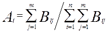 где Ai – весомость i –го объекта, i – номер объекта, n – количество объектов, j – номер эксперта, m – количество экспертов в группе, Bij – балл, присвоенный i –му объекту j –м экспертом.