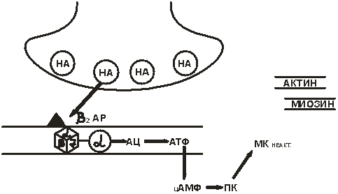 Рис. 11. b1-рецептор b2-рецептор (рис. 12). НА→b2-АР → активирование α-субъединицы G-белка → активирование АЦ → увеличивается образование цАМФ → стимулируется протеинкиназа → отщепляется киназа, катализирующая фосфорилирование миозинкиназы, при этом теряется активность последней → не происходит фосфорилирование миозина → расслабление ГМК. Регулирование высвобождения НА из нервных окончаний осуществляется самим медиатором при возбуждении α2-АР пресинаптической мембраны. Выброс НА при этом уменьшается.