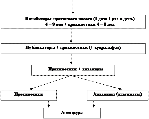 Примечание. Переход на нижестоящую ступень (указан стрелкой) осуществляется при улучшении состояния пациента. Отсутствие клинического эффекта лечения (уменьшение изжоги) при использовании высшей ступени в лечении тяжёлого эзофагита через 1 нед. требует увеличения дозы омепразола с 40 мг до 60-80 мг и выше.