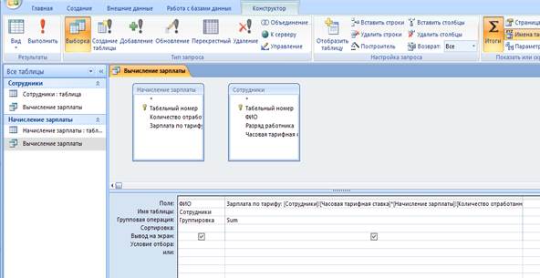 В диалоговом окне Добавление таблицы выделим наши таблицы, нажмём кнопку Добавить, таблицы появятся в верхней части Конструктора запросов. Из таблицы Сотрудники перетянем поле ФИО, из таблицы Начисление зарплаты – поле Зарплата по тарифу. Это поле является вычисляемым: в контекстном меню выберем команду Построить, в окне построителя выбирем таблицу Сотрудники, а из таблицы поле Часовая тарифная ставка (двойным щелчком), далее поставим знак умножения *, далее – из таблицы Начисление зарплаты – поле Количество отработанных часов – ОК. В контекстном меню поля выбираем команду Итоги, в конструкторе появится строка Групповая операция, для поля ФИО выбираем Группировка, для поля Зарплата по тарифу – функцию Sum. Сохраним запрос с именем Вычисление зарплаты.