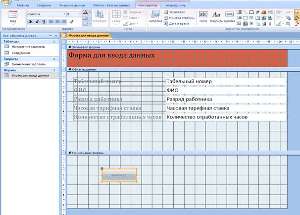 Нарисуем Кнопку в области Примечание формы, произвольно выбрав размеры Кнопки. Если автоматически откроется диалоговое окно Создание кнопок – нажмите отмена. В контекстном меню выбираем команду Обработка событий: