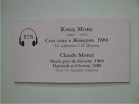 [18] Сергей Иванович Щукин (1854, Москва — 1936, Париж) — московский купец и коллекционер искусства, собрание которого положило начало коллекциям французской модернистской живописи в Эрмитаже и ГМИИ. Щукин входит в число известных меценатов Серебряного века. В отличие от большинства других русских коллекционеров рубежа XIX—XX вв., Щукин покупал картины на свой вкус, предпочитая импрессионистов, а затем и постимпрессионистов. Считается, что первое полотно Моне, купленное им в ноябре 1898 года — «Скалы в Бель-Иль» (ГМИИ). Это была первая картина Моне, появившаяся в России. К середине 1900-х годов он приобрел одиннадцать полотен мастера (среди них — «Сирень на солнце» и «Скалы в Бель-Иль»), а немного позднее — знаменитый «Завтрак на траве». http://ru.wikipedia.org/wiki/Щукин,_Сергей_Иванович [19] Наследники Щукина против декрета Ленина. // Газета «Коммерсантъ» № 106 (1991), 15.06.2000. Хранителем назначена дочь Щукина — Екатерина Сергеевна Келлер. http://www.kommersant.ru/doc.aspx?DocsID=150563.