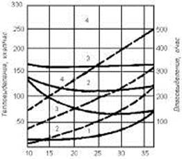 1- человек в покое; 2 - легкая работа в учреждении; 3 - физическая работа; 4 - тяжелый физический труд Рис. 2.6. График тепловлаговыделения человеком Таблица 2.5 - Поступление явной теплоты от взрослых мужчин, Вт