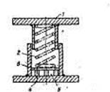 а - ребристая прокладка; б - дырчатая прокладка Рис: 7.5. Резиновые прокладки-амортизаторы Использование сплошного резинового листа в качестве амортизатора никакого эффекта виброизоляции не даст. В этом случае изоляцию следует выполняет в виде ленты, ширина которой не должна превышать толщину более чем в 2.. 3 раза, что позволит резине при ее осадке расширяться в стороны. Учитывая достоинства и недостатки пружинных и резиновых амортизаторов, широкое применение на практике нашли комбинированные пружинно резинное виброизоляторы (рис. 7.6). Пружина в комбинированных виброизоляторах обеспечивает их большую механическую прочность и осуществляет гашение низкочастотного спектра вибрации, а резиновая часть (стакан) изоляцию
