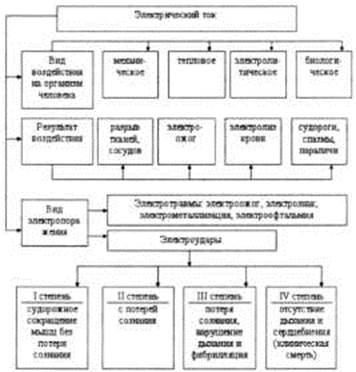 Электробезопасность - это система организационных и технических мероприятий и средств, обеспечивающих защиту людей от вредного и опасного электрического тока и статистического электричества. Проходя через организм человека (рис. 8.1), электрический ток оказывает механическое (разрыв тканей, сосудов), термическое (нагрев тканей, ожоги), электролитическое (разложение жидкостей, нарушение их физико-химического состава) и биологическое действие (судороги, паралич).