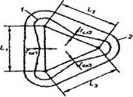 1 - граница зоны защиты на высоте hx; 2 - граница зоны защиты на уровне земли Рис. 9.6. Многократный стержневой молниеотвод в плане Пример 9.4. Спроектировать молниезащиту сельской усадьбы четырьмя отдельно стоящими молниеотводами, расположенными по углам прямоугольника (рис. 9.7). Наибольшая высота защищаемых строений hx =5м. Решение. По формуле (9.19) при известных hc =5 м (принимая hc = hx), L = 66 м и rсх =0 предварительно определяют h, учитывая, что высота двойного молниеотвода для зоны типа Б будет равна h = (hc+ 0,14Z)/l,13 = (5 + 0,14х6б)/1,13 = 12,6м Однако условием защищенности зданий и сооружений, расположенных на достаточно большой территории, многократным стержневым молниеотводом является rcx >0. С учетом этого высоту молниеотвода принимаем, например, 15м и производим соответствующие расчеты по проверке защищенности строений, которые находятся как в пределах, так и вне площади прямоугольника, образованного молниеотводами 1-4 Для этого необходимо построить сечение зоны защиты на высоте hx =5 м для молниеотводов 3 и 4. Пользуясь формулами (9.9) и (9.11), находят вершину конуса ко и радиус зоны защиты одного из молниеотводов rх ho=O,92-h = 0,92x15 =13,8 м, rх = 1,5 [(h - (hх/0,92)] = 1,5 [15 - (5/0,92)] = 14,4 м. По формуле (9.18) определяют защитный уровень кс по середине молниеотводов 3 и 4, находящихся на расстоянии h = 66 м К = hо- 0,14(L-h) = 13,8-0,14(66 - 15) =6,7м
